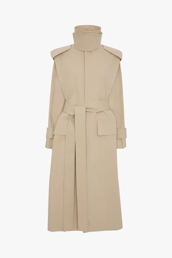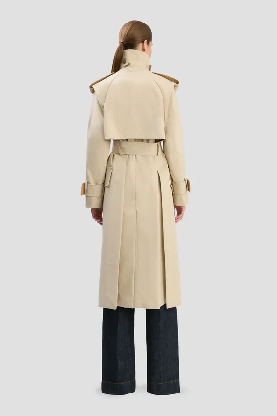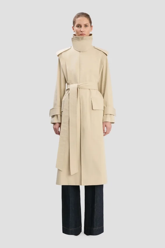 with its longline cut, oversized shoulder and funnel-neck silhouette, the philippa trench coat has a statement silhouette. a waist belt, throat latch and flap pockets add practical and polished design details, while butterfly lining ensures comfort and ease of movement.