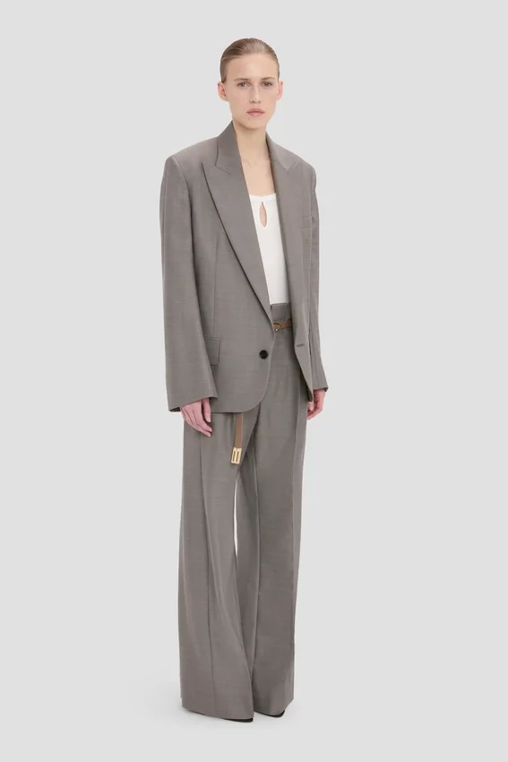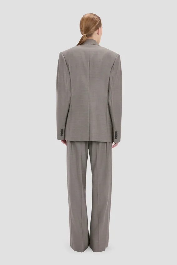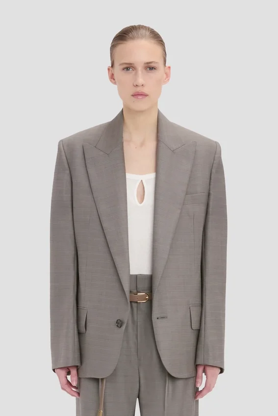 crafted in 100% virgin wool, the sculptural sleeve jacket in nickel is fully lined with a single-breasted cut. an oversized shoulder, tailored collar and discreet detail on the jacket melton give this piece its distinctive appeal. a hip-length hemline and flap pockets complete the look.