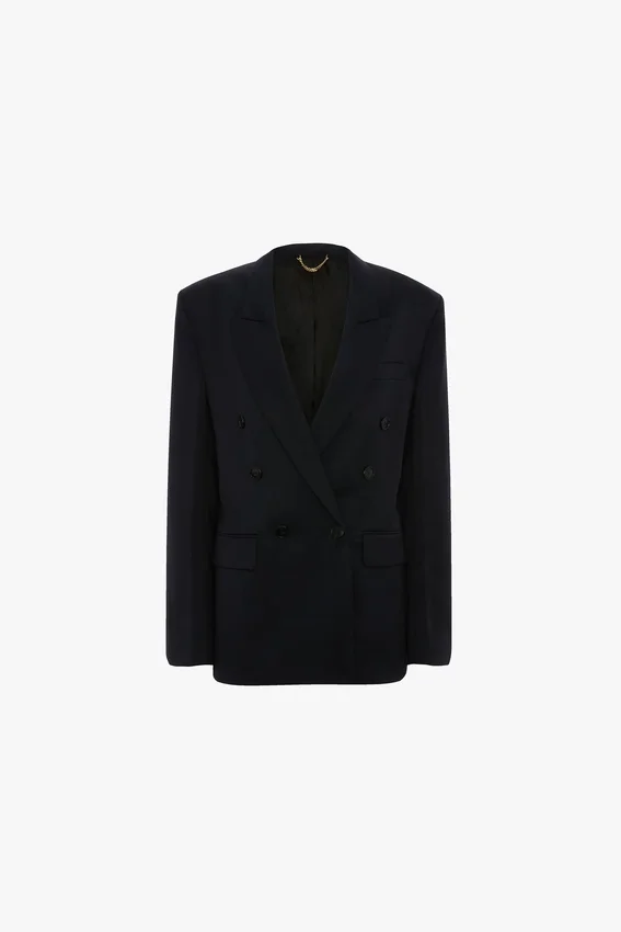 This wool-blend Double Breasted Tailored Jacket in Navy is cut with an oversized fit that finishes below the hip for a modern fluidity. Classic front jet pockets with flaps, a welt chest pocket and back double vents complete the look.