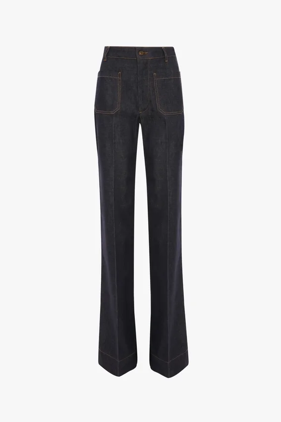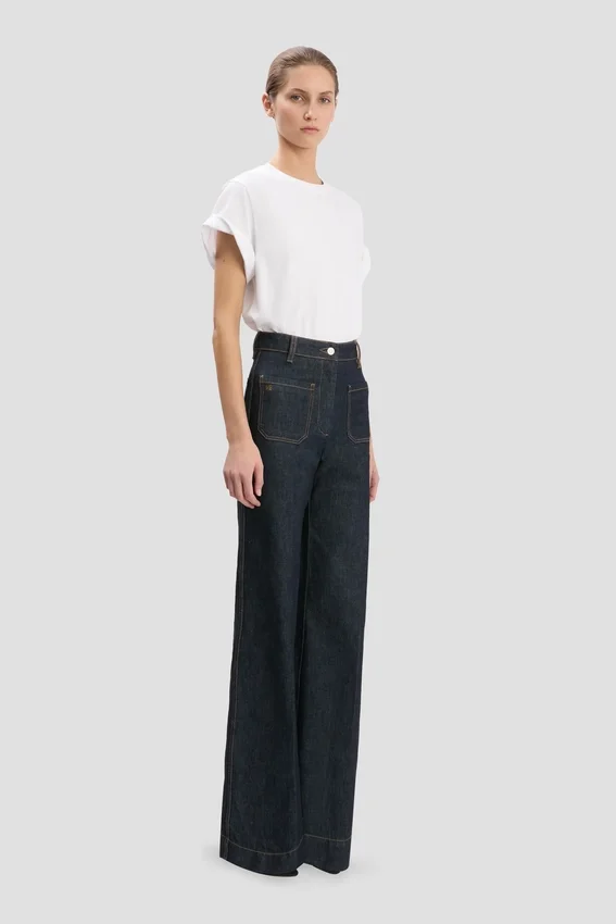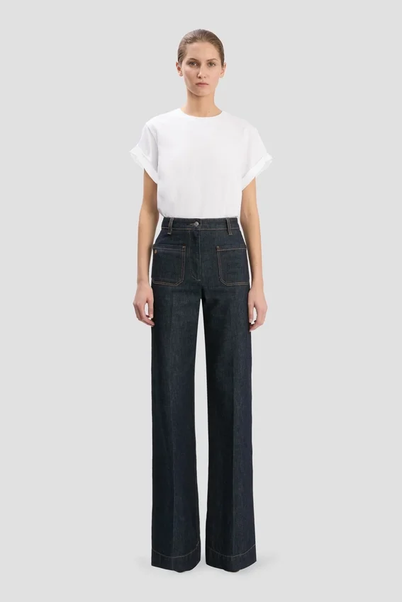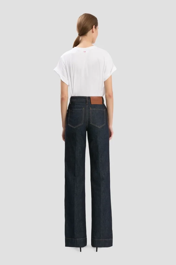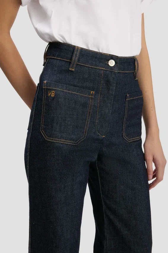 crafted from 100% cotton denim, the alina jeans have a high waist and wide leg for a figure-flattering silhouette. an indigo rinse elevates the utilitarian favourite, while patch pockets and a victoria beckham embroidered logo add attractive design details.