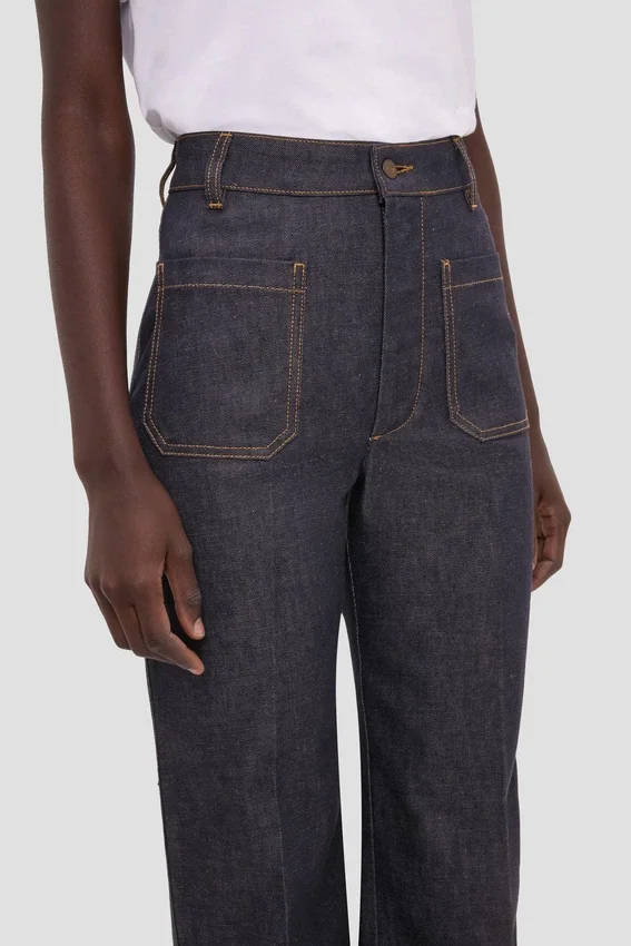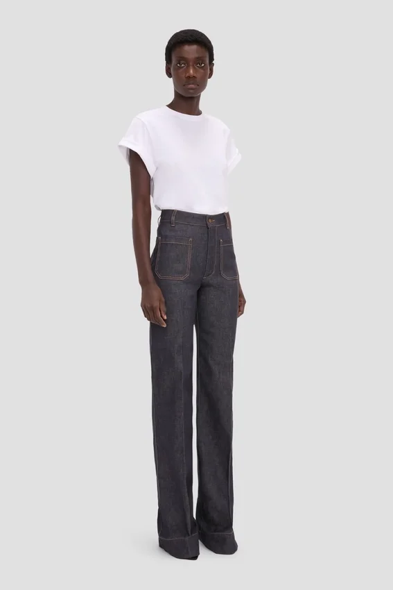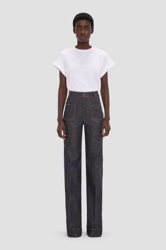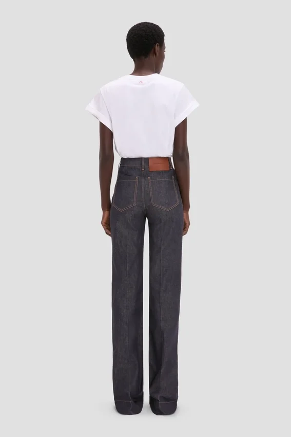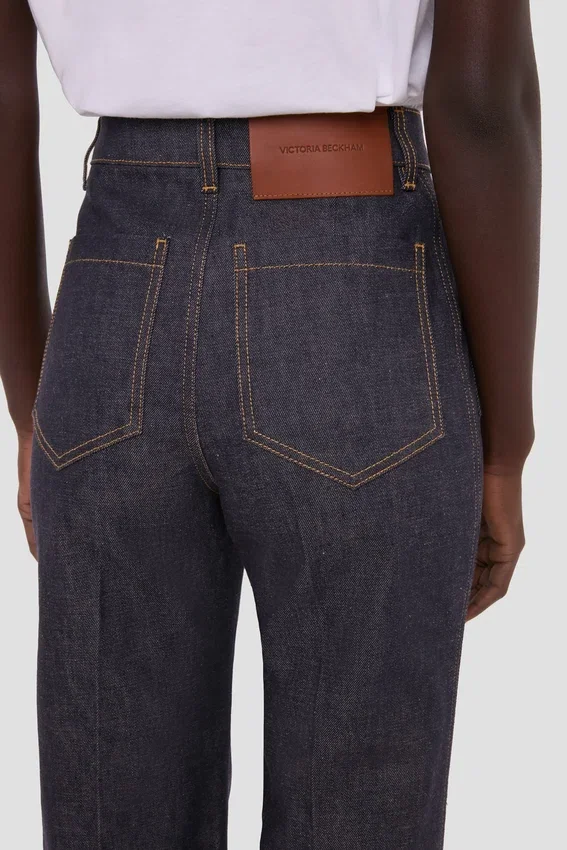 a high waistline, slim fit through the knee and subtly flared hemline give the alina jeans in indigo a sleek, leg-lengthening silhouette. crafted from 100% cotton japanese denim, they have attractive front patch pockets, branded hardware and a signature victoria beckham embroidered logo.