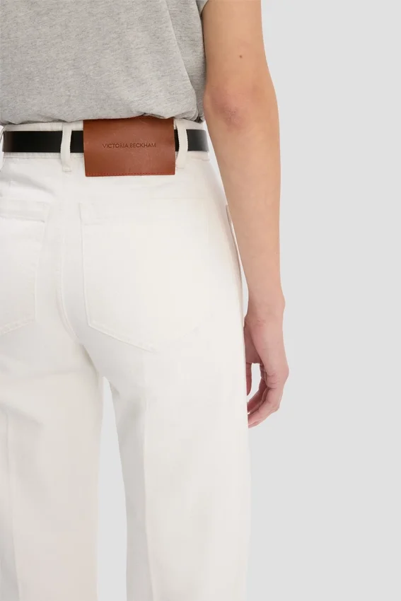 crafted from 100% cotton denim, the house’s signature alina jeans are presented in washed white for a preppy take on utilitarian denim. a high waist and wide leg nod to a classic 1970s silhouette. traditional patch pockets, a leather patch and victoria beckham embroidered logo complete the look.