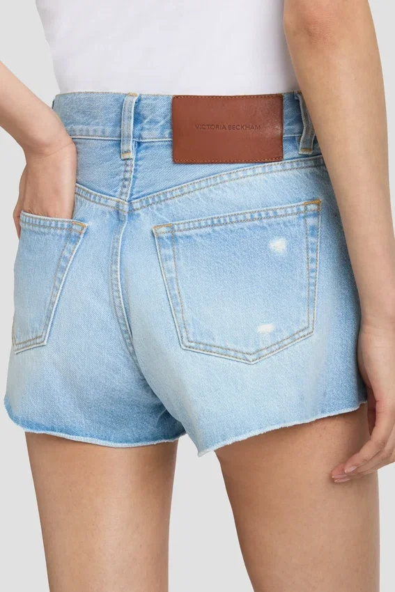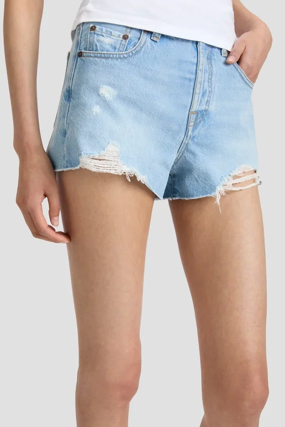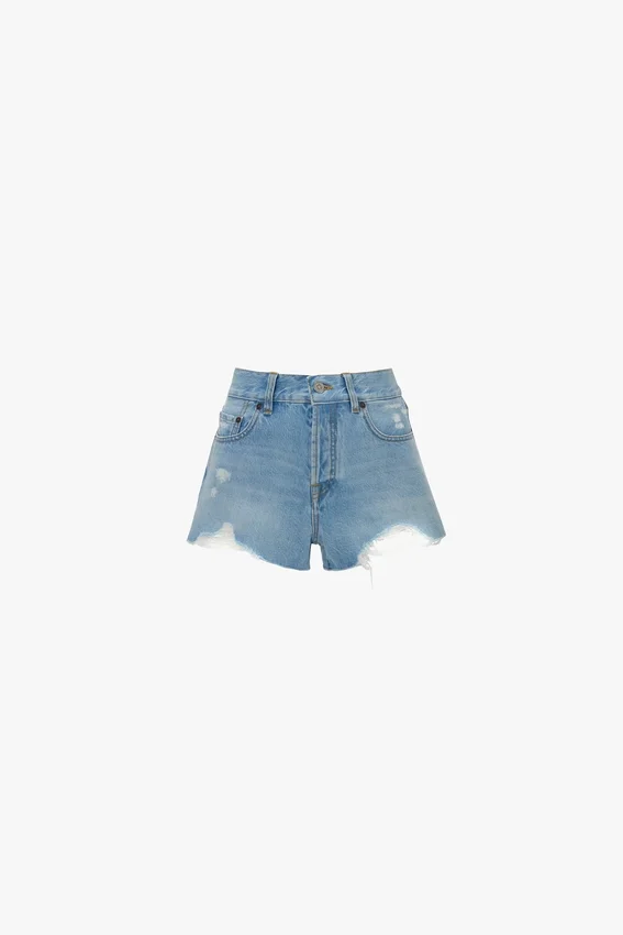 the distressed shorts in light blue have a bohemian undertone that is playfully relaxed. crafted from 100% organic non-stretch cotton denim, they have a low-rise waist and traditional five-pocket design. a branded leather patch and branded denim shank button complete the look.