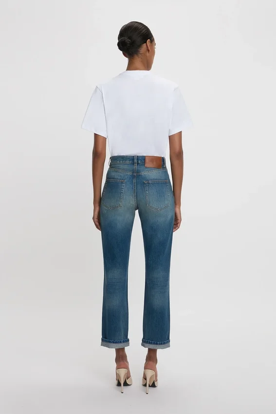 A personal favourite of Victoria’s, the mid-rise Victoria Jean is a modern and versatile wardrobe essential. Crafted from 100% cotton denim and presented exclusively in Mid Blue, it embodies the house’s unerring attention to detail with design features including tobacco topstitching, branded copper rivets and a branded