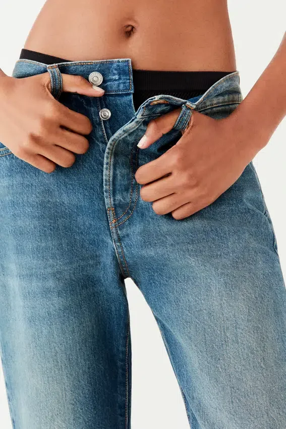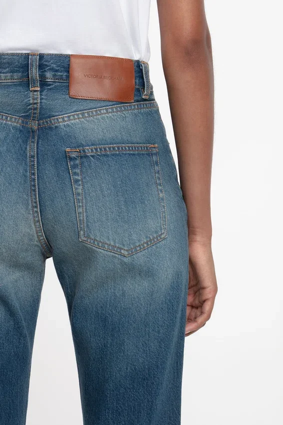 a personal favourite of victoria’s, the mid-rise victoria jean is a modern and versatile wardrobe essential. crafted from 100% cotton denim and presented exclusively in mid blue, it embodies the house’s unerring attention to detail with design features including tobacco topstitching, branded copper rivets and a branded leather patch at the waistband.