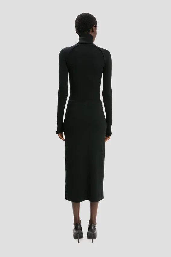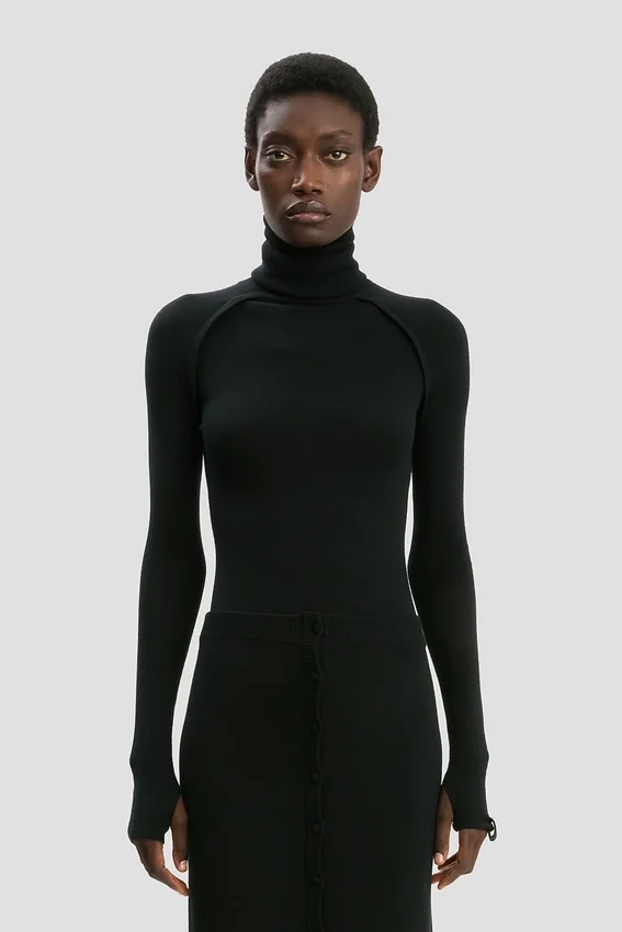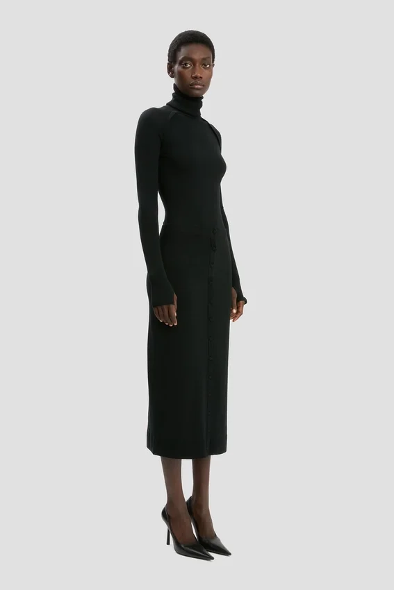 crafted from 100% merino wool, the high neck jumper has a slim cut and a centre front-button placket. a ribbed stretch waistband and ribbed knit hemline enhance the silhouette, while knit-covered buttons keep the look understated yet elevated. presented in classic black, it is a sophisticated wardrobe basic.