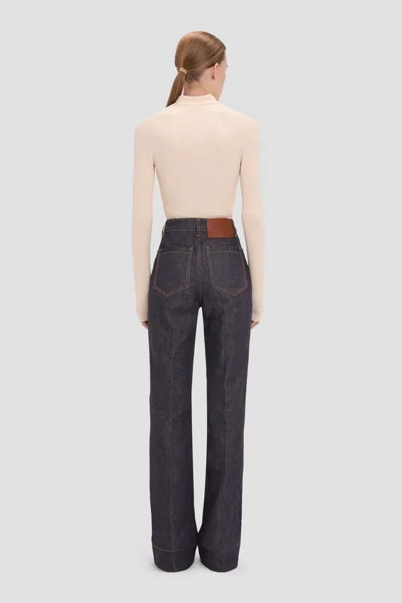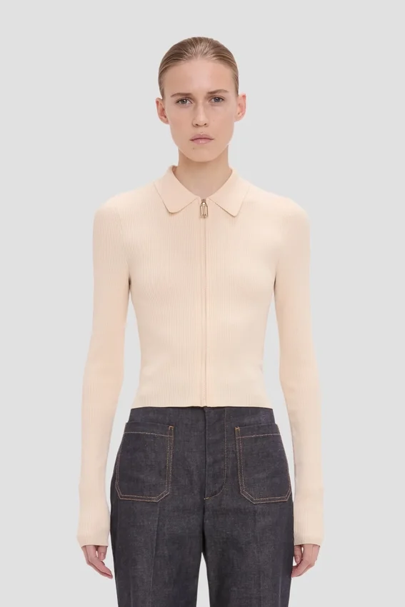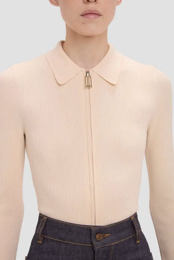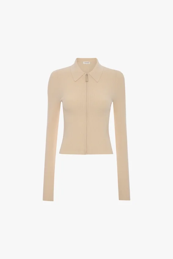 a rib stitch adds a subtle texture to the mila top. a traditional collared neckline, long sleeves and a hip-length hemline imbue it with wear-anywhere appeal, while the subdued sandstone colourway allows for versatile styling.