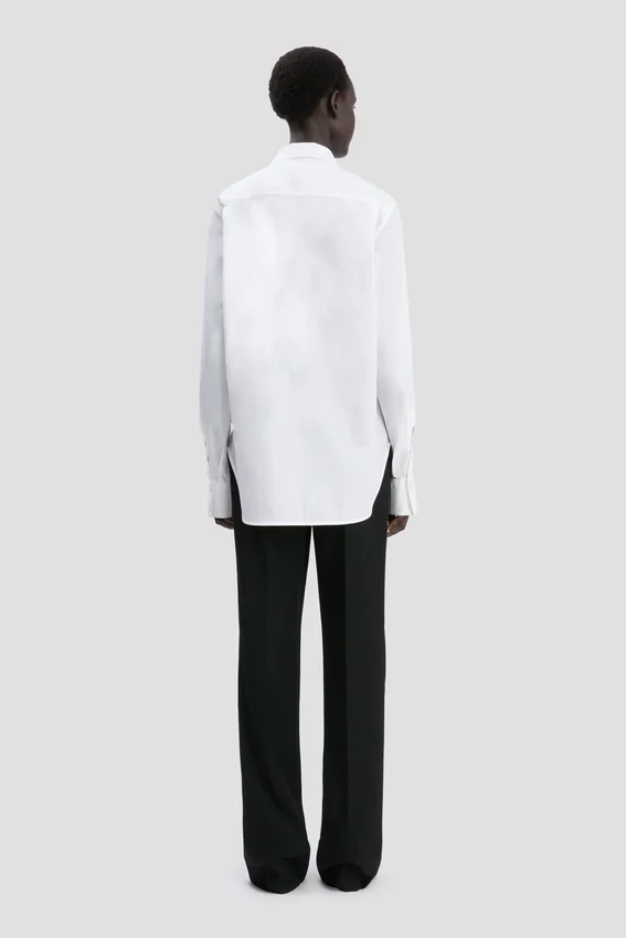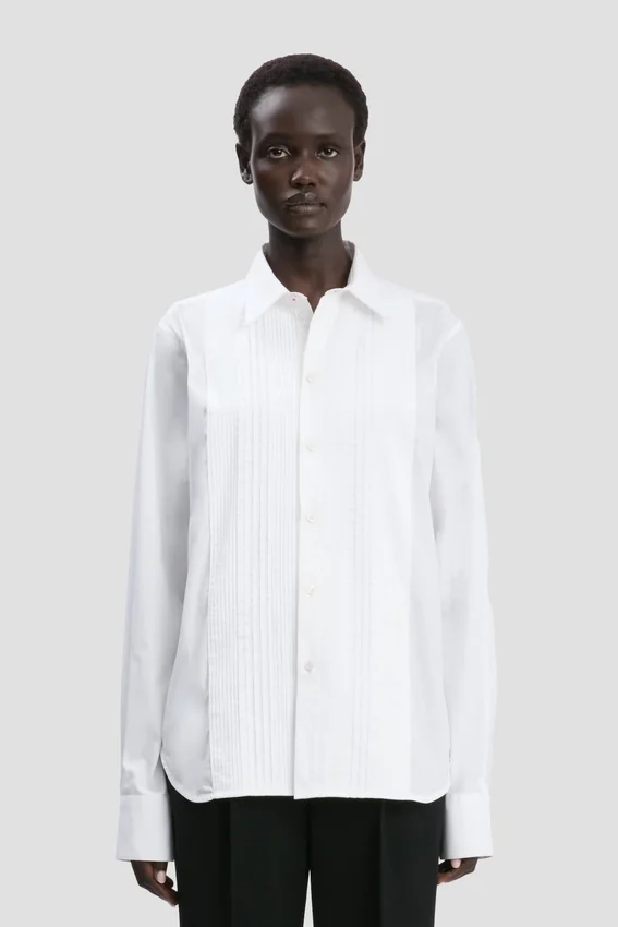 a crisp cotton poplin gives the pin tuck shirt a razor-sharp silhouette. elevated with pintuck pleating on the front panel, it has a back yoke detail with tonal topstitch and back pleats beneath. it is finished with a distinctive pointed sleeve placket.