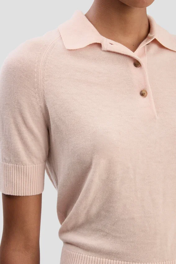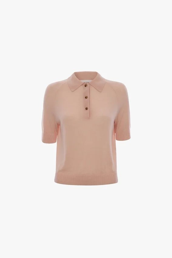 casual but refined, the polo top in pale rose is crafted from a lightweight, fine-gauge knit. it has a traditional collar with buttons, relaxed raglan sleeves and a ribbed trim. it is finished with a victoria beckham embroidered tape at the back of the neck.