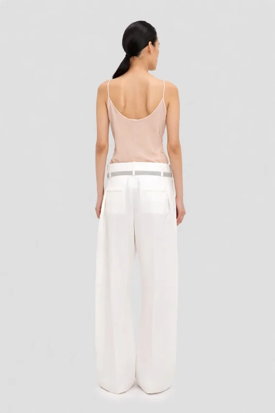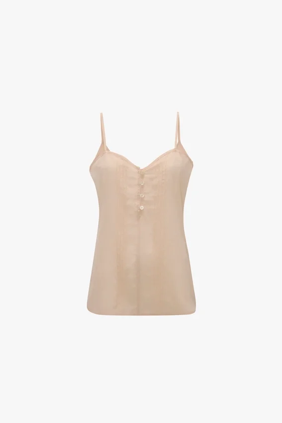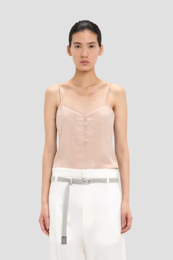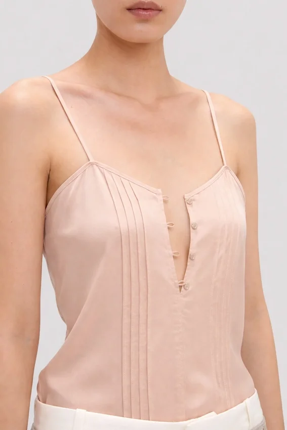 a sensuous low back elevates the rouleaux cami top. hip length and sleeveless, it also has a pin-tuck detail for a discreet but distinctive finishing touch. presented in tender blossom, it is a provocative but polished piece of ready-to-wear.