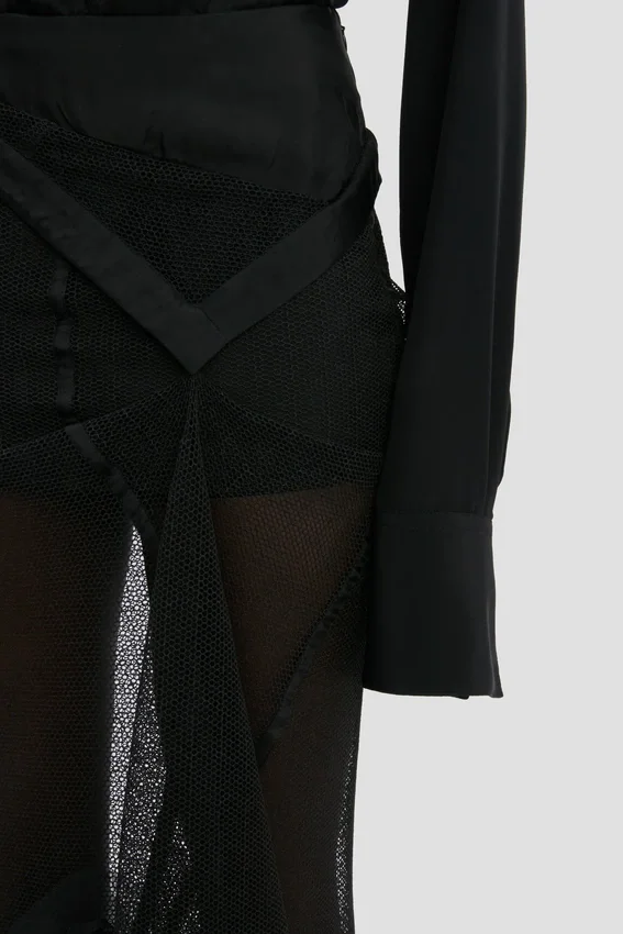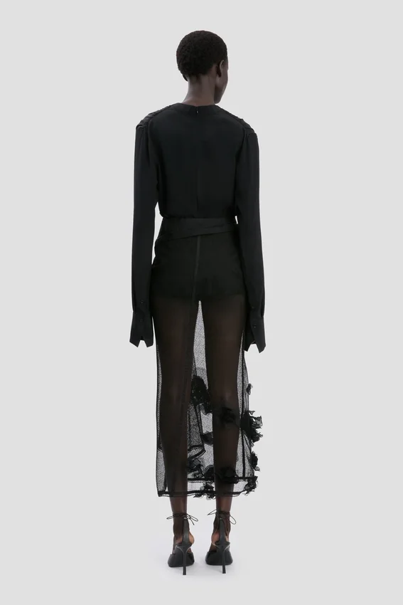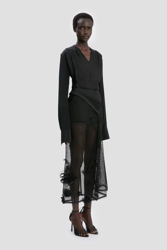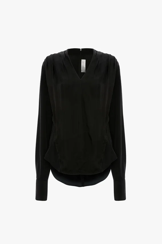 long sleeves with distinctive overlong cuffs add a contemporary perspective to the v-neck top in classic black. designed in a heavyweight crepe de chine, it has a traditional v neckline with a subtle gathered detailing for added interest. exposed side seams add a tactile point of difference.