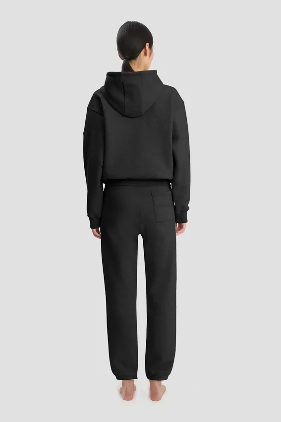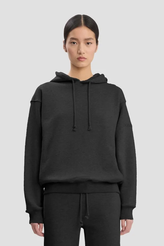 an elevated take on athleisure wear, the logo embroidered hoodie in black is crafted from 100% cotton for a super-soft finish. a drawstring hood and front pockets bring practicality and versatility, while a tonal victoria beckham embroidered monogram on one sleeve completes the look.