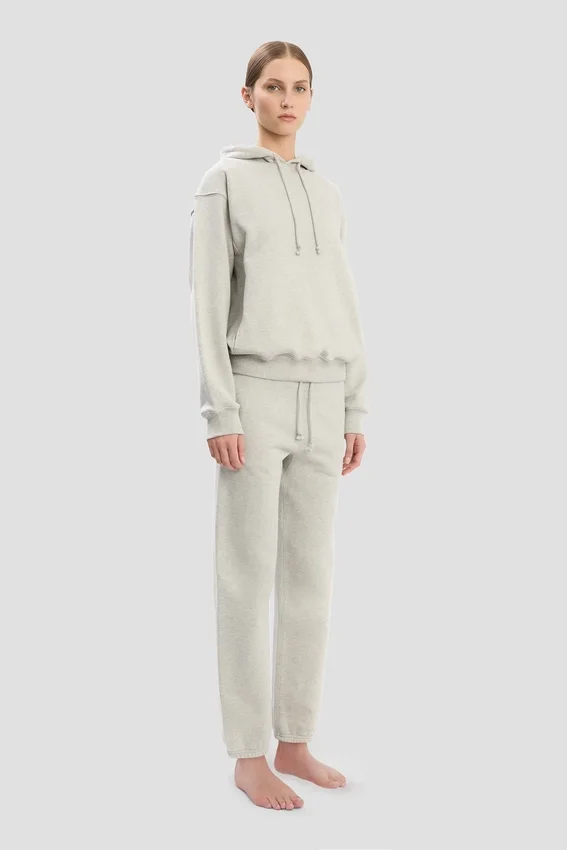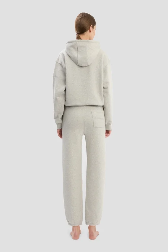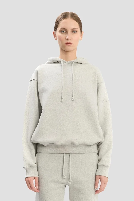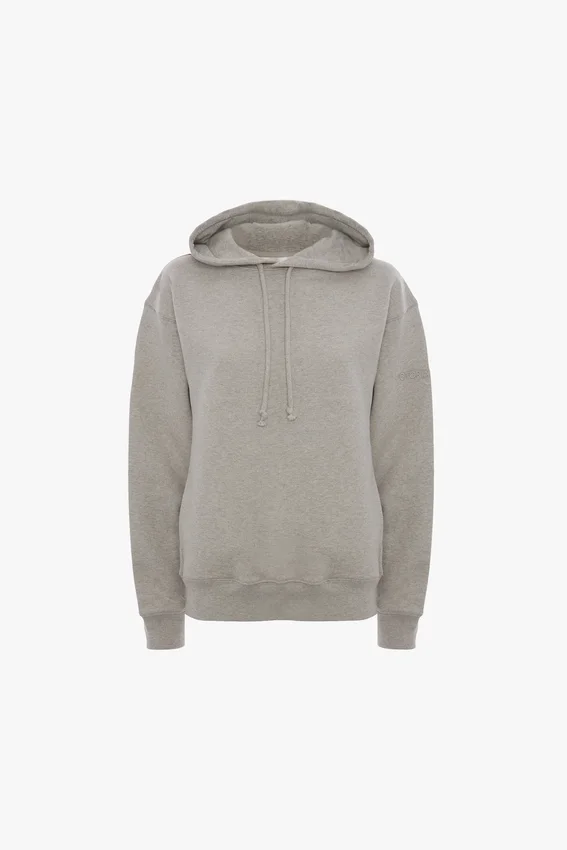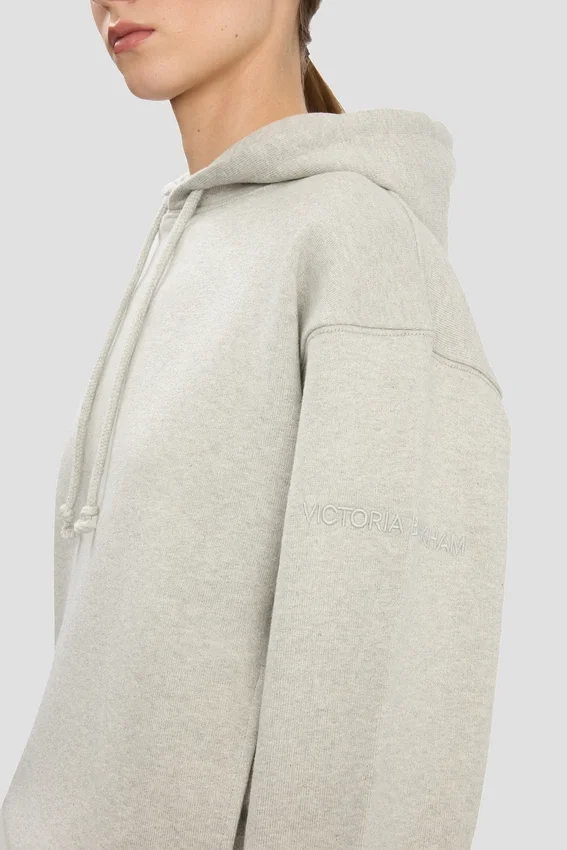 an elevated take on athleisure wear, the logo embroidered hoodie in grey marl is crafted from 100% cotton for a super-soft finish. a drawstring hood and front pockets bring practicality and versatility, while a tonal victoria beckham embroidered monogram on one sleeve completes the look.