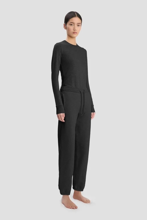 with its lightweight jersey fabrication and slim fit, the long sleeve t-shirt in black is a refined take on a wardrobe basic. designed with a traditional crew neckline and ribbed neckhole and cuffs, it is finished with a victoria beckham embroidered monogram at the back of the neck.