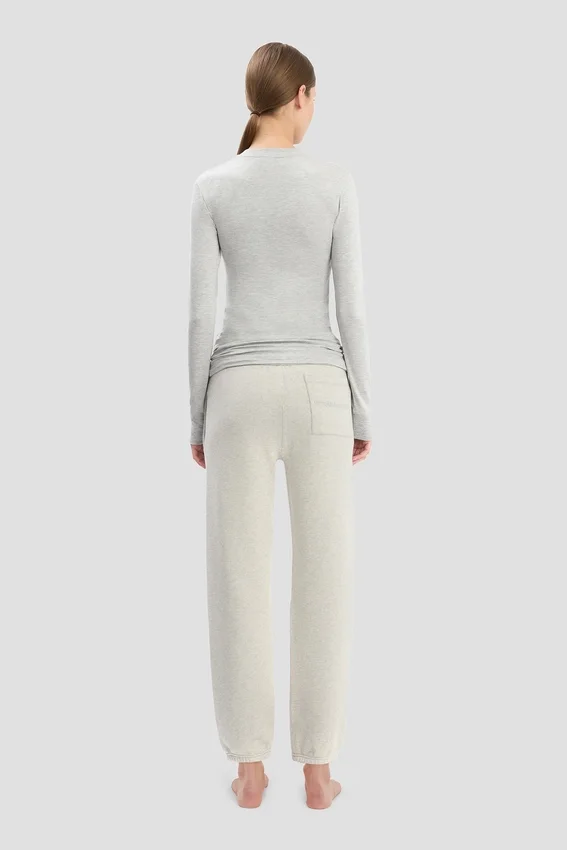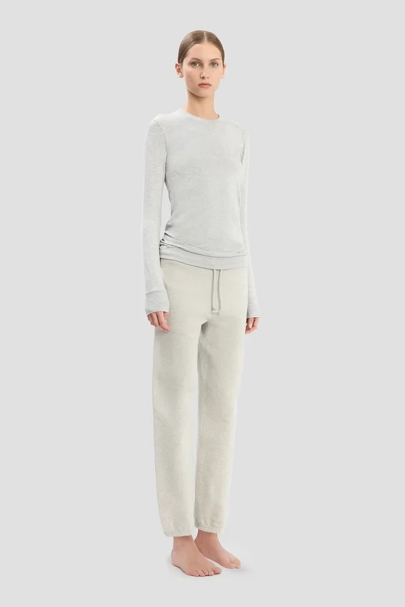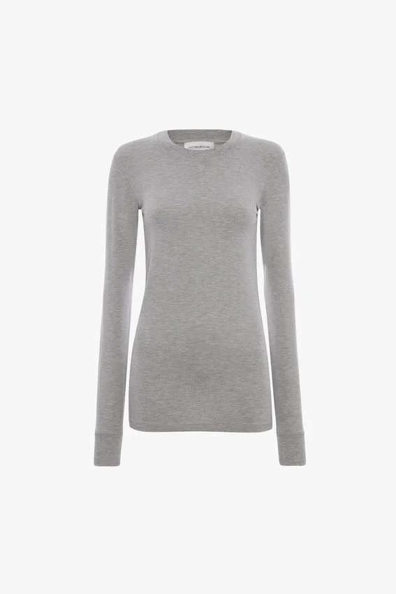 with its lightweight jersey fabrication and slim fit, the long sleeve t-shirt in grey marl is a refined take on a wardrobe basic. designed with a traditional crew neckline and ribbed neck hole and cuffs, it is finished with a victoria beckham embroidered monogram at the back of the neck.