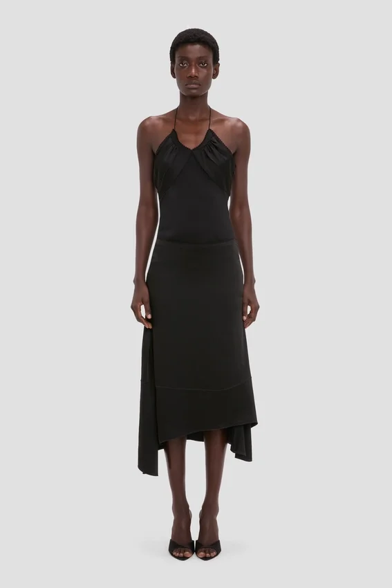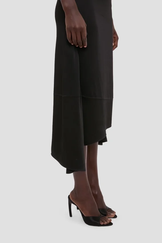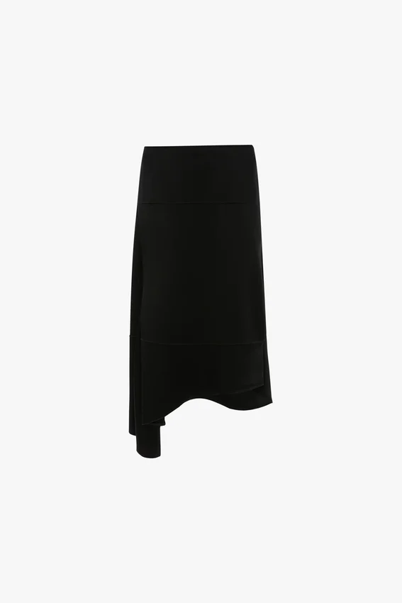 crafted from crepe back satin, the asymmetric midi skirt in black has a mid-rise waistline and knee-length hemline. a contrasting waistband with internal trim adds a decorative talking point, while its pocketless design ensures a streamlined silhouette.
