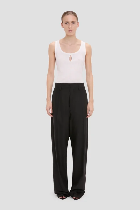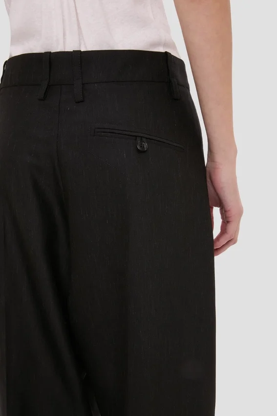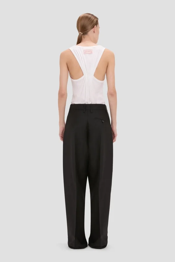 tailored for a relaxed silhouette, the curved leg trousers are crafted from wool melange with a mid-rise waistline and long-length hemline. a self-fabric waistband elongates the silhouette, while the classic black colourway has enduring appeal.