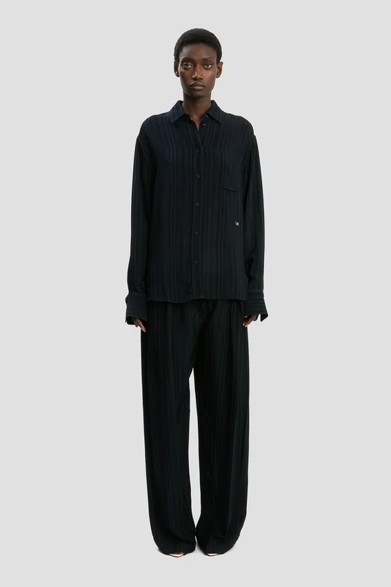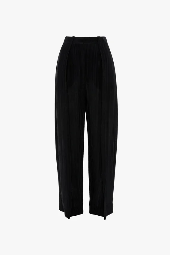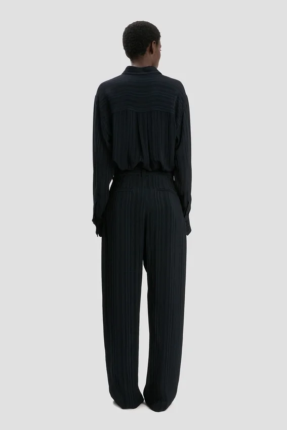 a ribbed jacquard fabrication brings a tactile finish to the wide leg trouser. presented in versatile navy, it has a high-rise cut with flattering front pleats and side pockets for a masculine undertone. traditional back jet pockets and belt loops complete the look.