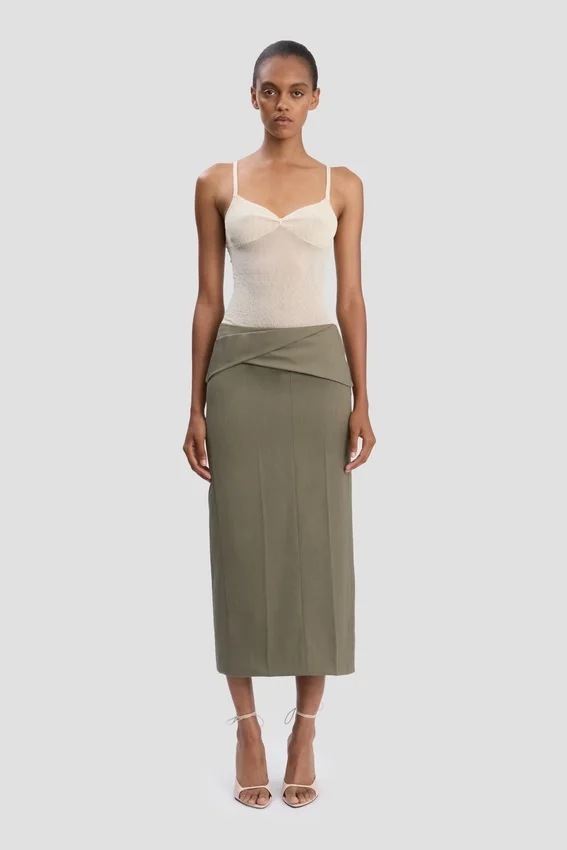 Crafted from a wool melange and fully lined, the Wrap Skirt in Sage is a sophisticated proposition. A faux wrap detail at the front adds visual interest, while a back belt ensures a neat silhouette. Back double welt pockets complete the look.